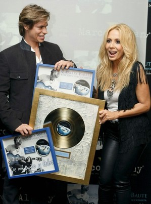 La cantante Marta Sánchez hace acto de entrega al cantante venezolano Carlos Baute de un disco de oro, por las ventas de , ‘De mi puño y letra’, en un acto que ha tenido lugar en Madrid.